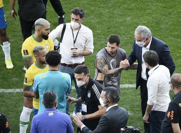 Agentes da Anvisa e da Polícia Federal entraram em campo para retirar quatro jogadores da Argentina durante o primeiro tempo da partida contra o Brasil, neste domingo, na Neo Química Arena, pelas Eliminatórias da Copa do Mundo.