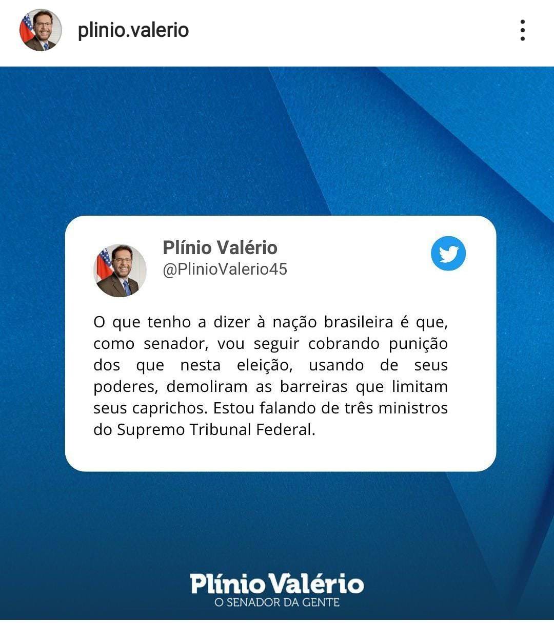 Apoiador do atual presidente do Brasil, Jair Messias Bolsonaro (PL), o senador Plínio Valério (PSDB-AM) mandou um recado na rede social Twitter nesta terça-feira, 1, ao ministros do Supremo Tribunal Federal (STF).