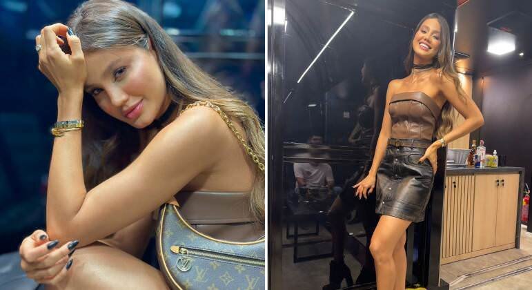 Com uma peça exclusiva da Lança Perfume que ainda não foi disponibilizada para vendas, Biah usou um tomara-que-caia e uma saia em tom marrom.