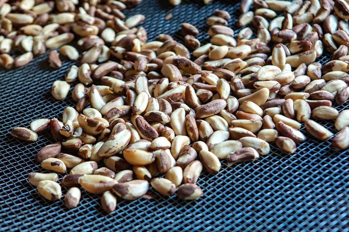 Castanhas na mesa de triagem. Processamento da castanha na mini usina da Comunidade do Rio Novo, um afluente do rio Iriri na Terra do Meio.
