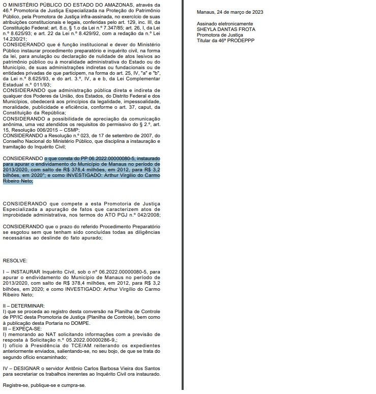 O Ministério Público instaurou o Inquérito Civil (IC), sob o nº 06.2022.00000080-5, para investigar o endividamento do de Manaus no período de 2013/2020, com salto de R$ 378,4 milhões, em 2012, para R$ 3,2 bilhões, em 2020. O documento tem como investigado o ex-prefeito Arthur Neto.