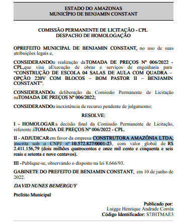 Para realizar os serviços no município, o prefeito contratou a Construtora Amazônia LTDA, inscrita sob o CNPJ nº 10.572.827/0001-23.