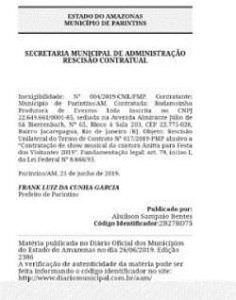 O Diário Oficial dos Municípios desta quarta-feira (26), publicou a rescisão contratual que cancela o contrato com a empresa Rodamoinho Produtora de Eventos Ltda que é responsável pela realização do show da Anitta.