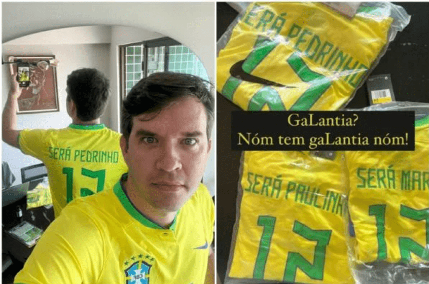 Porém, as camisas chegaram personalizadas com os nomes ‘Será Paulinha’, ‘Será Maria Clara’ e ‘Será Pedrinho’. Em suas redes sociais, Pedro Gurgel compartilhou sua experiência e brincou com o fato de não poder pedir a troca dos produtos. “‘Galantia’?, ‘non’ tem ‘galantia nón’”.