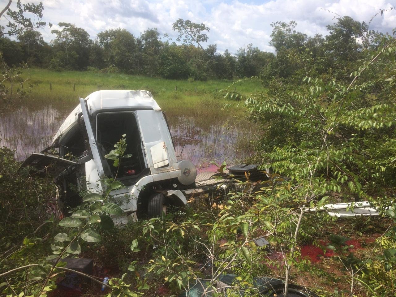 Caminhão tomba na BR-174 e motorista fica preso entre as ferragens