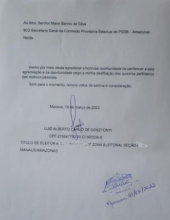 Alegando “interesses pessoais”, o ex-vereador Luiz Alberto Carijó deixou o PSDB do ex-prefeito de Manaus Arthur Neto. A carta de desfiliação de Carijó foi enviada ao diretório Municipal do Partido da Social Democracia Brasileira na última sexta-feira, 18.