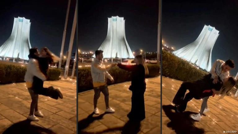 Astiyazh Haghighi, de 21 anos, e seu noivo Amir Mohammad Ahmadi, de 22 anos, foram presos em novembro após o vídeo de danças românticas em frente à torre Azadi (“liberdade”, em persa), na capital do Irã, viralizar.