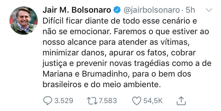 O presidente Jair Bolsonaro (PSL), publicou no Twitter que fará o que estiver ao alcance para atender as vítimas, minimizar danos, apurar os fatos, cobrar da justiça e previnir novas tragédia como Mariana e Brumadinho, na manhã deste sábado (26/01).
