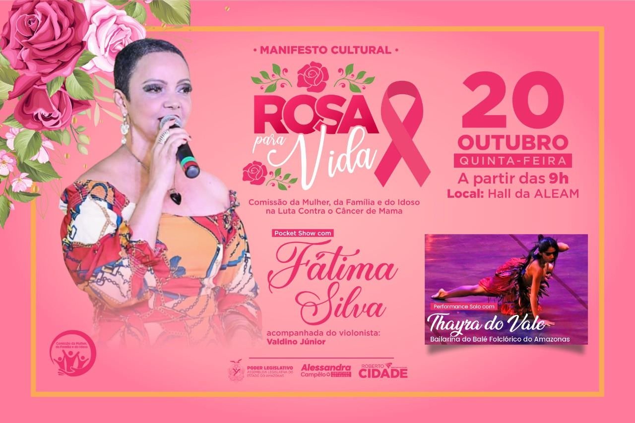 O manifesto cultural “Rosa para Vida” terá participação da cantora Fátima Silva, que fará um pocket show acompanhada do violonista Valdino Júnior. A atividade também contará com a presença da bailarina Thayra do Vale, do Balé Folclórico do Amazonas, que fará uma performance solo. O evento é aberto ao público.