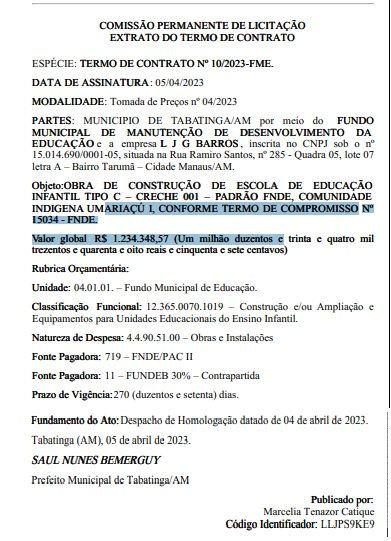 Saul Nunes Bemerguy vai pagar o valor global de R$ 1.234.348,57 à empresa, para construir a creche na comunidade indígena de Tabatinga.
