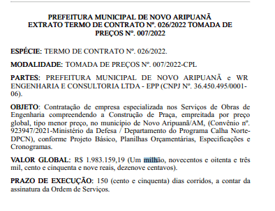 O gestor municipal contratou para prestar os serviços a empresa Wr Engenharia E Consultoria Ltda – EPP, inscrita no CNPJ Nº. 36.450.495/0001- 06, pelo valor global de R$ 1.983.159,19.