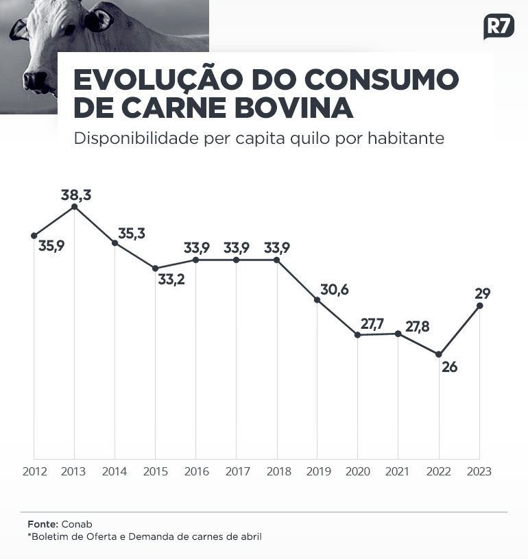 Com o crescimento da produção, o consumo de carne bovina pelos brasileiros vai aumentar em 2023, após cinco anos de queda. De acordo com a projeção da Conab (Companhia Nacional de Abastecimento), a disponibilidade per capita da proteína vai passar de 26 para 29 quilos por habitante no ano, uma alta de 11,6%.