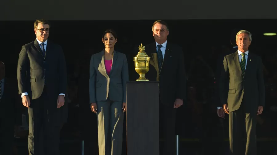 O órgão foi recebido pelo presidente Jair Bolsonaro e pela primeira-dama, Michelle Bolsonaro, na rampa presidencial do Piratini, após desembarcar do Rolls-Royce presidencial.