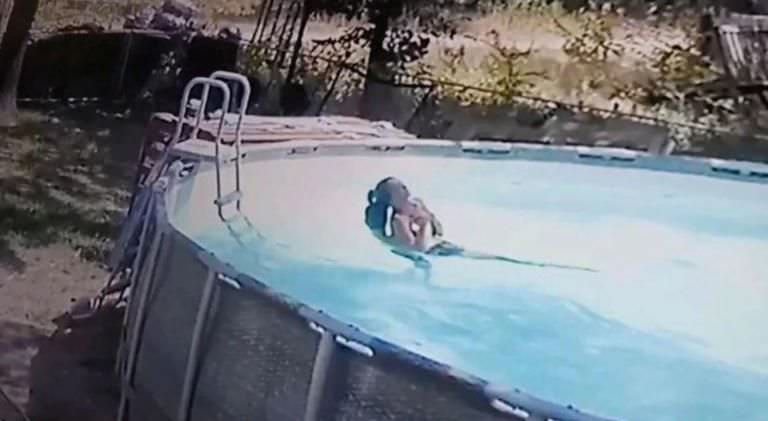 Nas imagens, é possível ver ele pulando na piscina e arrastando a mãe para a escada. Após a ação do garoto, o pai de Lori chega e ajuda a retirá-la da água.