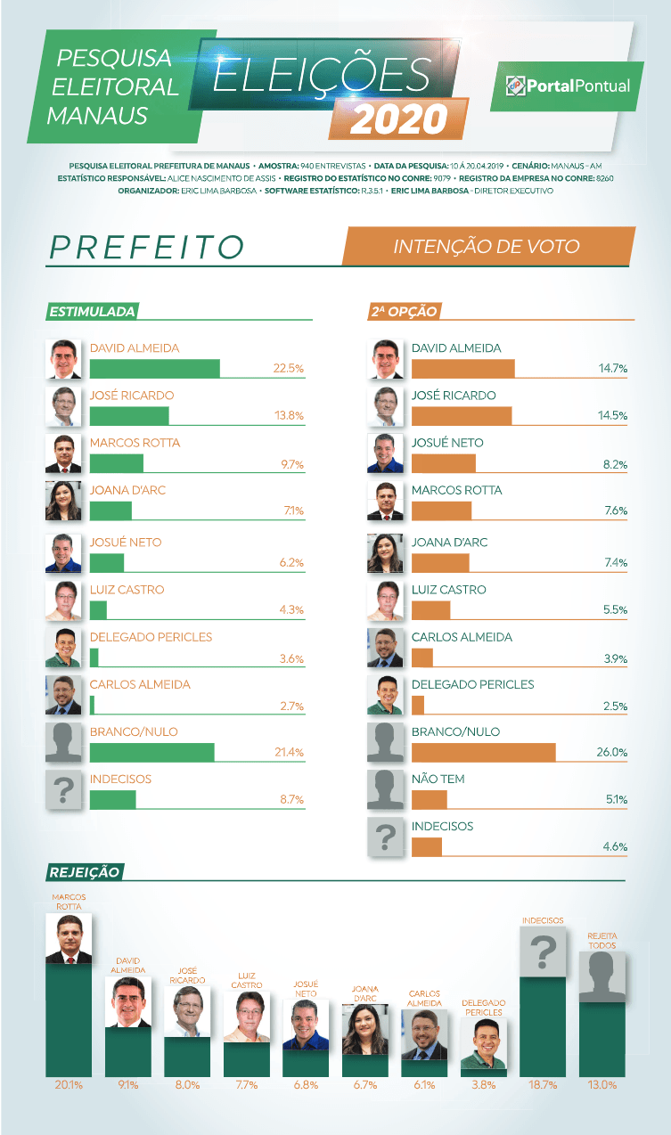 O Instituto Pontual realizou um estudo em Manaus no período de 10 a 20 de abril, totalizando 940 entrevistas presenciais, com o intuito de identificar qual candidato está favorável para concorrer à prefeitura de Manaus.