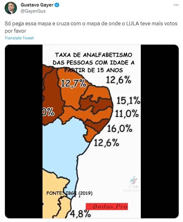 Em publicação feita no Twitter na noite desta quarta-feira (7/6), Gayer compartilha um vídeo com dados do Instituto Brasileiro de Geografia e Estatística (IBGE) de 2019 para exibir números sobre o analfabetismo em todas as regiões do país e insinua que as taxas do Nordeste justificam a hegemonia eleitoral do petista na região.