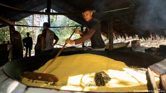 Barro Alto é o nome da comunidade onde a família mora, localizada a um dia de voadeira da casa de farinha. Durante a safra da mandioca, tios, primos, filhos e irmãos se revezam no local para produzir a farinha. No dia da visita da DW Brasil, dez membros da família trabalhavam na casa de farinha, enquanto as crianças brincavam em volta.
