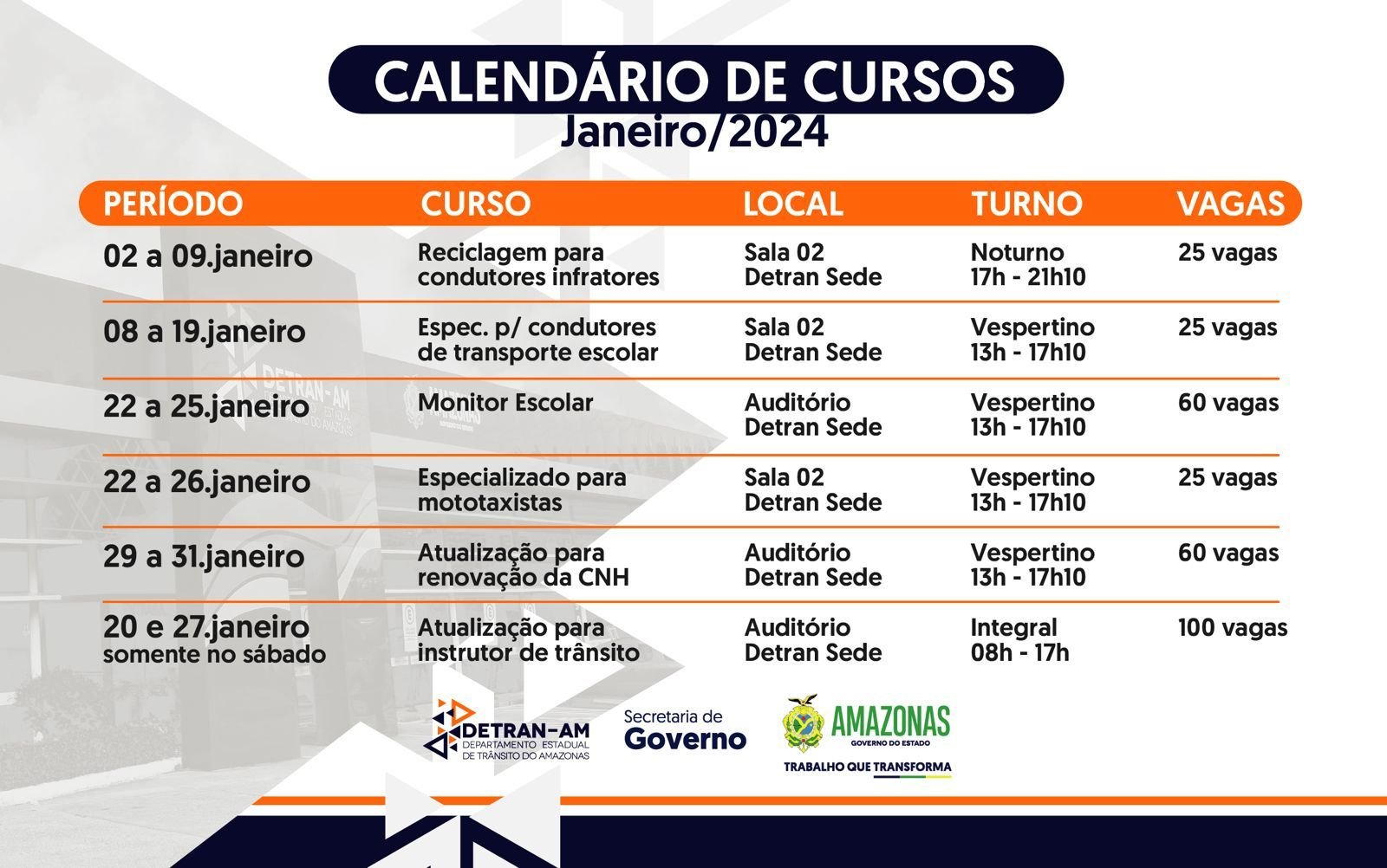 O Departamento Estadual de Trânsito do Amazonas (Detran-AM) informa que está com as inscrições abertas para os cursos de Reciclagem para Condutores Infratores, Especializado para Condutores de Transporte Escolar, Monitor Escolar, Especializado para Mototaxistas, Atualização para Renovação da Carteira Nacional de Habilitação (CNH), além de Atualização para Instrutor de Trânsito. Todos irão iniciar em janeiro de 2024.