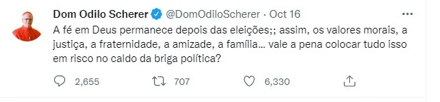 “A fé em Deus permanece depois das eleições; assim, os valores morais, a justiça, a fraternidade, a amizade, a família… vale a pena colocar tudo isso em risco no caldo da briga política?”, tuitou dom Odilo.