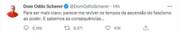 Diante de comentários que mencionaram uma suposta “ditadura da esquerda”, o arcebispo fez um alerta: “Tempos estranhos esses nossos! Conheço bastante a história. Às vezes, parece-me reviver os tempos da ascensão ao poder dos regimes totalitários, especialmente o fascismo. É preciso ter muita calma e discernimento nesta hora!”