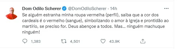Dom Odilo Scherer, cardeal e arcebispo metropolitano de São Paulo, usou o Twitter para publicar uma reflexão sobre conflitos políticos entre amigos e familiares nesse domingo (16/10), e foi alvo de críticas. Ele chegou a ser chamado de “comunista” por usar roupas vermelhas, e precisou explicar que trata-se da liturgia da Igreja Católica.