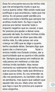 Em mensagem enviada via whatsApp e divulgada pela mulher,  o universitário se disse arrependido e afirmou que faria de tudo para “reverter o impacto negativo que causou”.