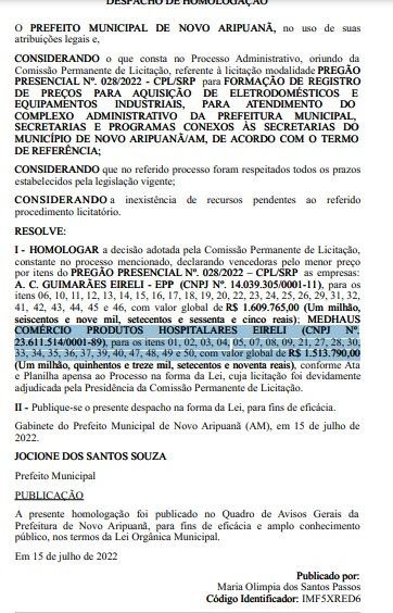 Para prestar os serviços, o prefeito contratou duas empresas entre elas, a A. C. Guimarães Eireli – EPP, inscrita no CNPJ Nº. 14.039.305/0001-11, com valor de R$ 1.609.765,00 e a Comércio Produtos Hospitalares Eireli, inscrita no CNPJ Nº. 23.611.514/0001-89, com total de R$ 1.513.790,00.