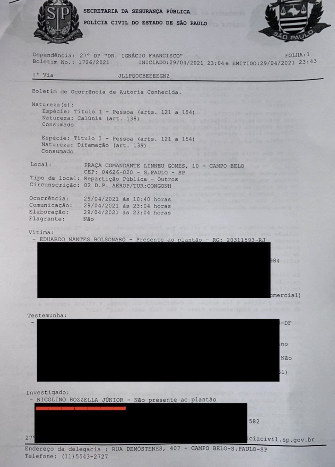 Eduardo Bolsonaro negou que o encontro teria ocorrido assim, e foi à polícia paulista expor sua versão dos fatos: