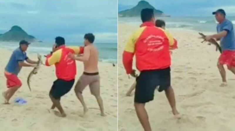 No vídeo, é possível ver que dois homens brigam pelo réptil que está na areia. O terceiro envolvido é um salva-vidas do Corpo de Bombeiros que tenta apartar a disputa. É nesse momento que um dos homens pega o animal e o aponta como se fosse uma arma. Ainda não se sabe o que motivou o conflito entre os banhistas pelo filhote.