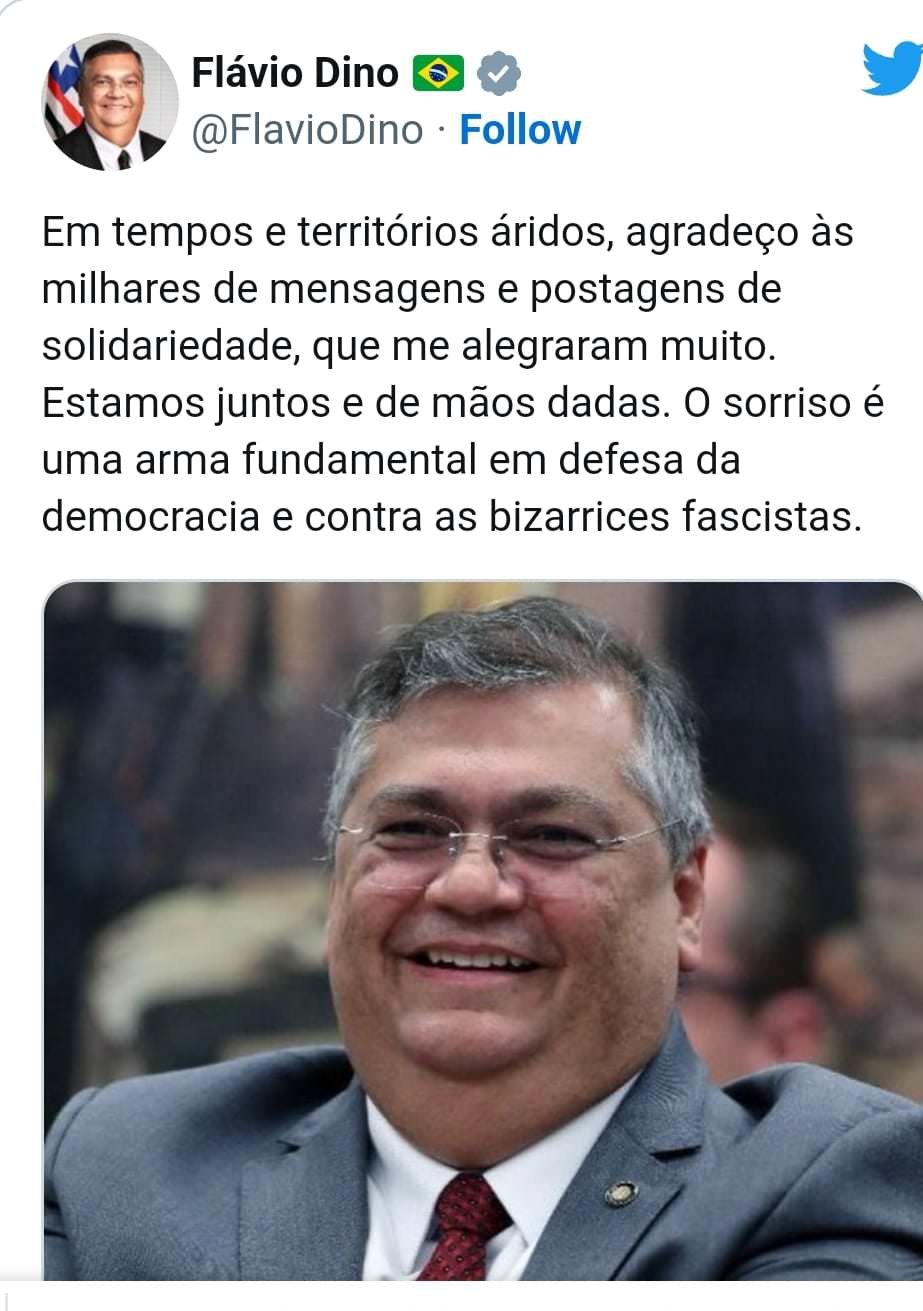 Dino também agradeceu aos seguidores nas redes sociais e as mensagens de solidariedade. “Em tempos e territórios áridos, agradeço às milhares de mensagens e postagens de solidariedade, que me alegraram muito. Estamos juntos e de mãos dadas. O sorriso é uma arma fundamental em defesa da democracia e contra as bizarrices fascistas”.