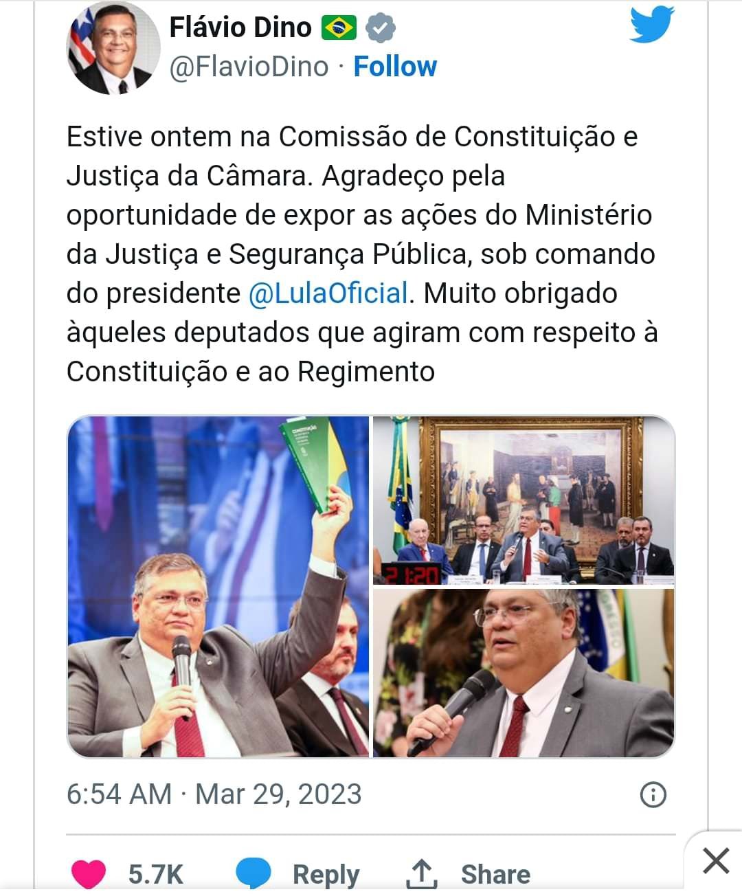 “Estive ontem na Comissão de Constituição e Justiça da Câmara. Agradeço pela oportunidade de expor as ações do Ministério da Justiça e Segurança Pública, sob comando do presidente @LulaOficial. Muito obrigado àqueles deputados que agiram com respeito à Constituição e ao Regimento”, escreveu Dino, demonstrando mais uma vez lealdade ao presidente Lula, como fez na resposta à deputada Rosângela Moro (União-PR).