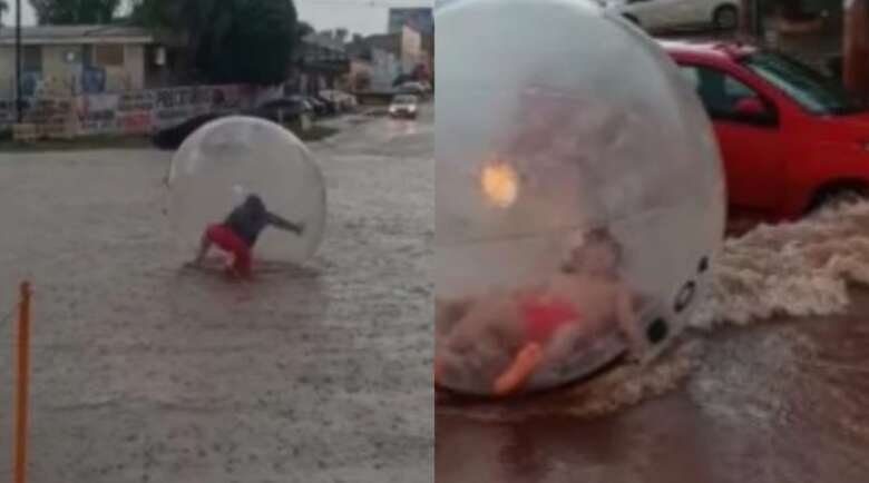 Vídeos de um homem flutuando em uma bolha aquática num ponto de inundação de Vicente Pires viralizaram nas redes sociais. A forte chuva que caiu no Distrito Federal nesta terça-feira (22) alagou diversos pontos da cidade que ficou intrafegável. O homem aproveitou a situação e fez algo inédito. O homem aparece boiando pela água dentro da bolha de plástico, enquanto carros passam ao lado. A gravação mostra a esquina da Rua 5 com a Rua 6 da cidade.