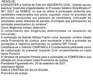 O inquérito civil apura eventual “possíveis irregularidades no Processo Seletivo Simplificado nº 001 /2021 da SEMED, no que se refere à pontuação atribuída aos candidatos relacionados nos autos; supostos vícios no processo de entrevista conduzidas por parentes de candidatos; indicação de candidatos pelos diretores de escolas municipais que participaram da comissão examinadora do certame”.