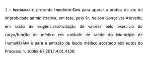O documento apura a prática de ato de improbidade administrativa, em tese, pelo Sr. Nelson Gonçalves Azevedo, em razão de exigência/solicitação de valores pelo exercício do cargo/função de médico em unidade de saúde do Município de Humaitá/AM e para a emissão de laudo médico acostado aos autos do Processo n. 10068-67.2017.4.01.4100.