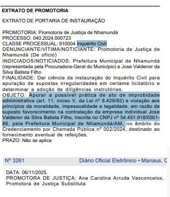 O Ministério Público do Estado do Amazonas (MPAM), por meio da Promotoria de Justiça de Nhamundá, oficializou a abertura de um Inquérito Civil (IC) para investigar possíveis irregularidades em um processo licitatório da Prefeitura Municipal. O foco da investigação é o fornecimento de refeições para a administração pública.