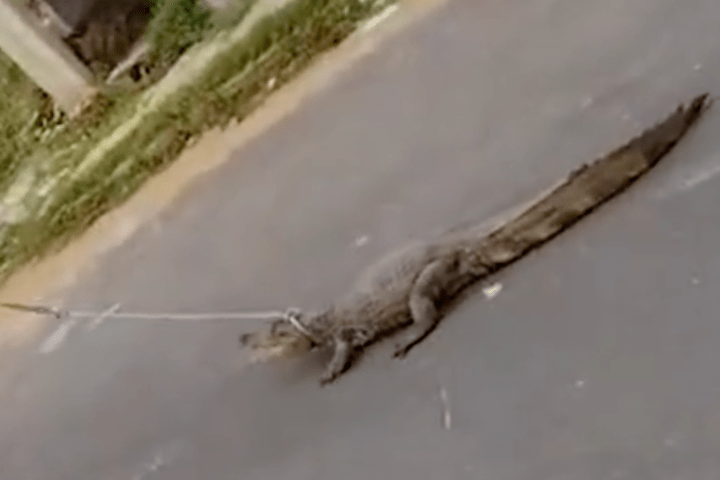 Nas imagens compartilhadas em grupos de WhatssApp, o jovem amarra a corda no pescoço do réptil e sai arrastando o animal pela rua, como uma espécie de coleira. É possível observar o jacaré irritado tentando impedir o ato do jovem, freando a captura com as próprias patas.