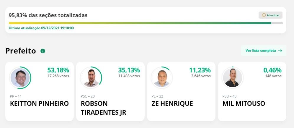 O candidato Keitton Pinheiro (Progressistas) venceu a eleição para a Prefeitura de Coari, município distante 363 quilômetros de Manaus, com mais de 53% dos votos válidos. O segundo colocado, Robson Tiradentes (PSC).