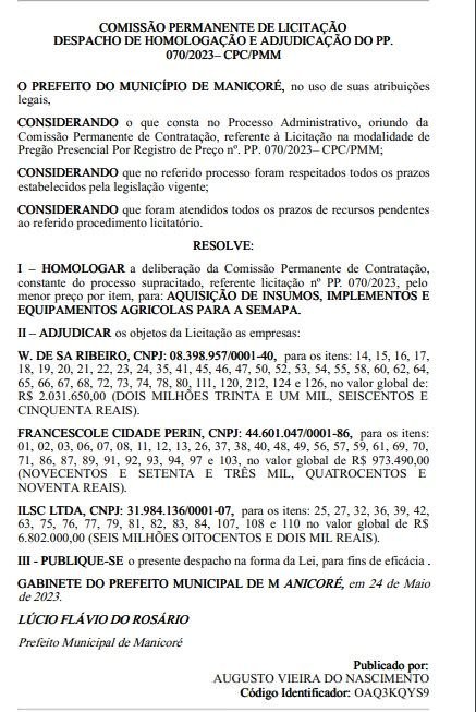 O prefeito vai pagar o valor global de R$ 9.807.425,00 às empresas, para fornecer aquisição de insumos, implementos e equipamentos agrícolas para Manicoré.