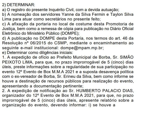 O Ministério Público do Amazonas (MP-AM) instaurou um inquérito civil nesta segunda-feira, 13, para apurar eventual ato de improbidade administrativa e de infração política administrativa praticados pelo Prefeito de Borba, Simão Peixoto Lima, relativo à realização do 12º Evento de Box M.M.A 2021, ocorrido no dia 11 de dezembro de 2021, na Quadra Poliesportiva Edvar Souza, no Município.