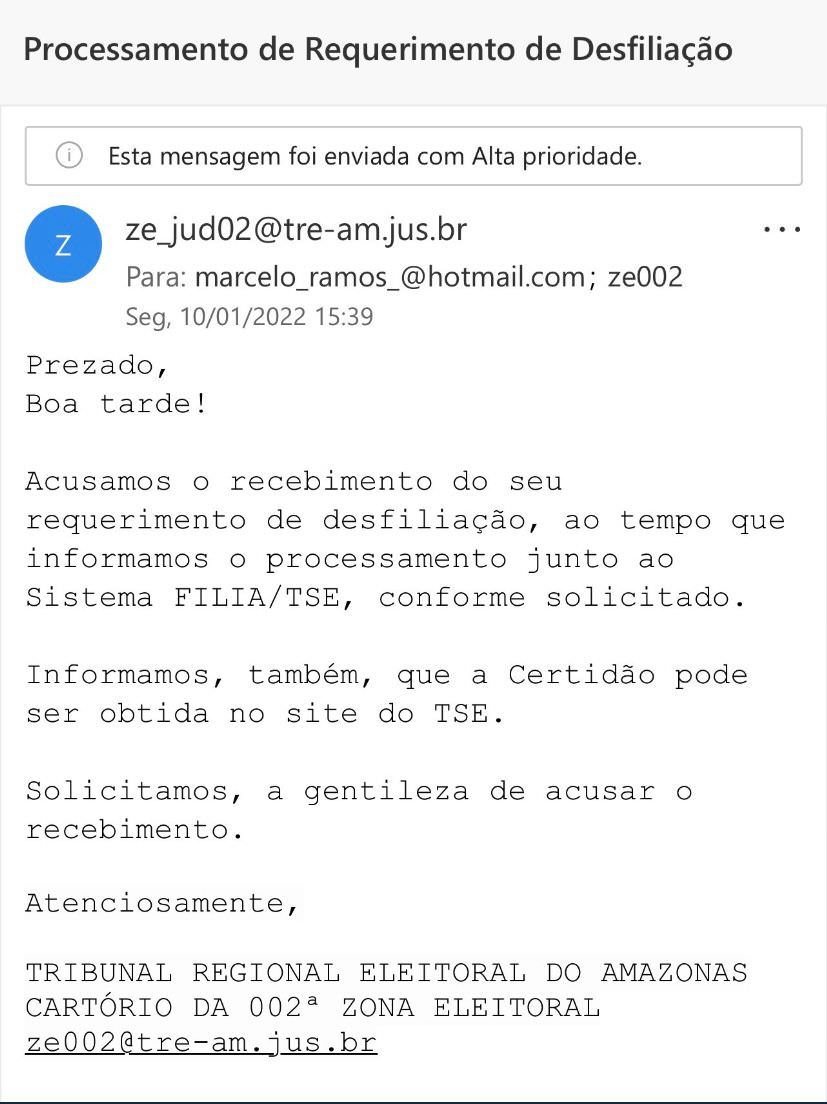 “Comunico que, após liminar deferida pelo TSE, no último dia 10 o TRE-AM oficializou minha desfiliação do PL. Até o início de março anunciarei o partido ao qual me filiarei para disputar as eleições. Agora não é tempo de eleição, é tempo de toda energia para ajudar o Amazonas e o Brasil”, diz Marcelo Ramos.