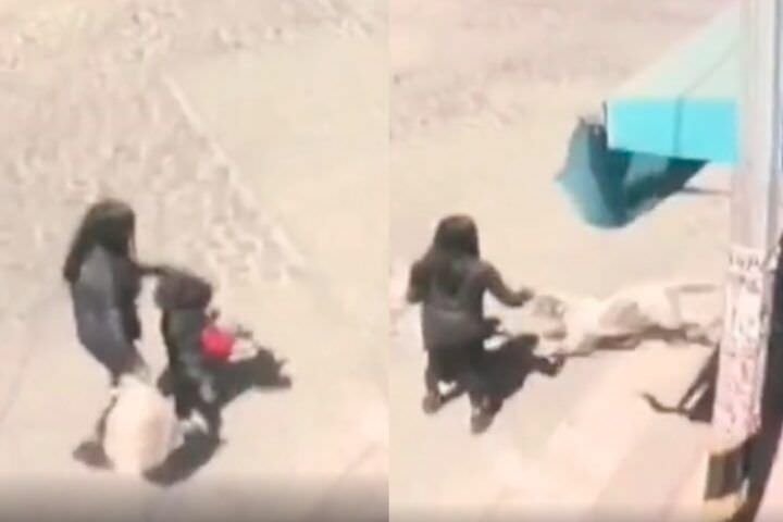 Em seguida, um cachorro sai do caminho e pula sobre a menor e consegue arrastá-la alguns metros, o que faz com que sua mãe tente ajudá-la.