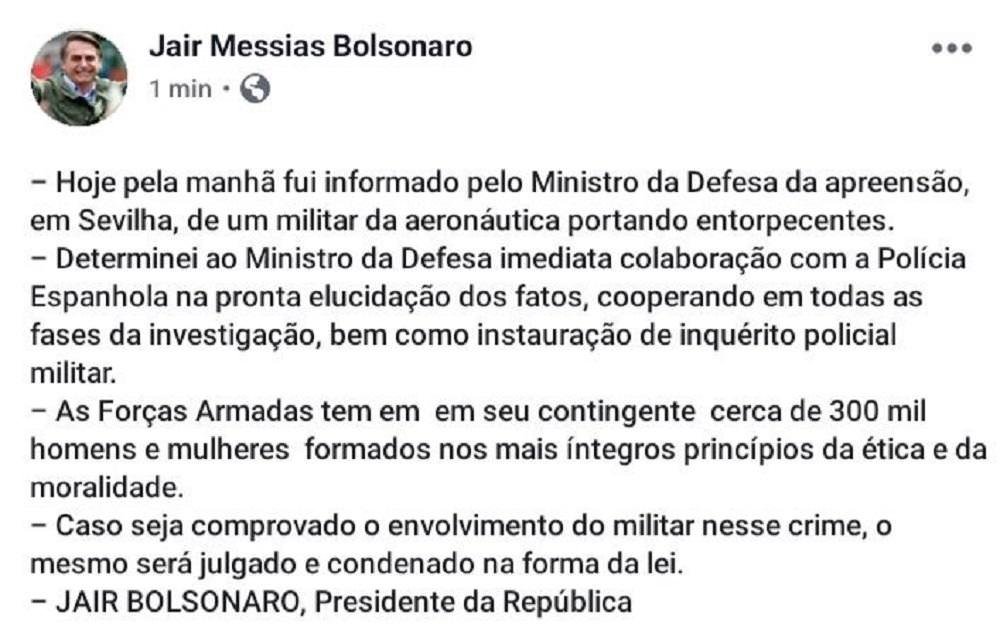 O presidente Jair Bolsonaro, que faria escala na cidade, publicou mensagem no Twitter dizendo ter sido informado pelo ministro da Defesa, general Fernando Azevedo e Silva, da apreensão do militar portando entorpecentes.