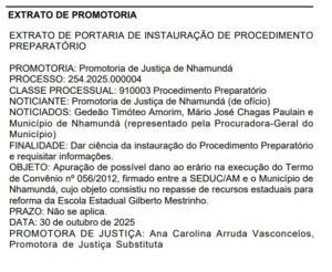 O procedimento (nº 254.2025.000004), aberto de ofício, examina o repasse de recursos estaduais destinados à reforma da Escola Estadual Gilberto Mestrinho. Além de Amorim, são alvos da apuração o ex-prefeito de Nhamundá, Mário José Chagas Paulain, e o próprio Município. O objetivo é verificar se houve execução indevida ou desvio de finalidade na aplicação das verbas repassadas há 13 anos.