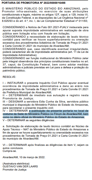 O Ministério Público do Estado do Amazonas (MPAM) instaurou nesta sexta-feira, 11,  um Inquérito Civil (IC)  com o objetivo de apurar eventual ocorrência de improbidade administrativa e dano ao erário nos procedimentos de Tomada de Preço 01.2021 e Carta Convite 01.2021 da Prefeitura Municipal de Alvarães cidade distante 531 quilômetros de Manaus.
