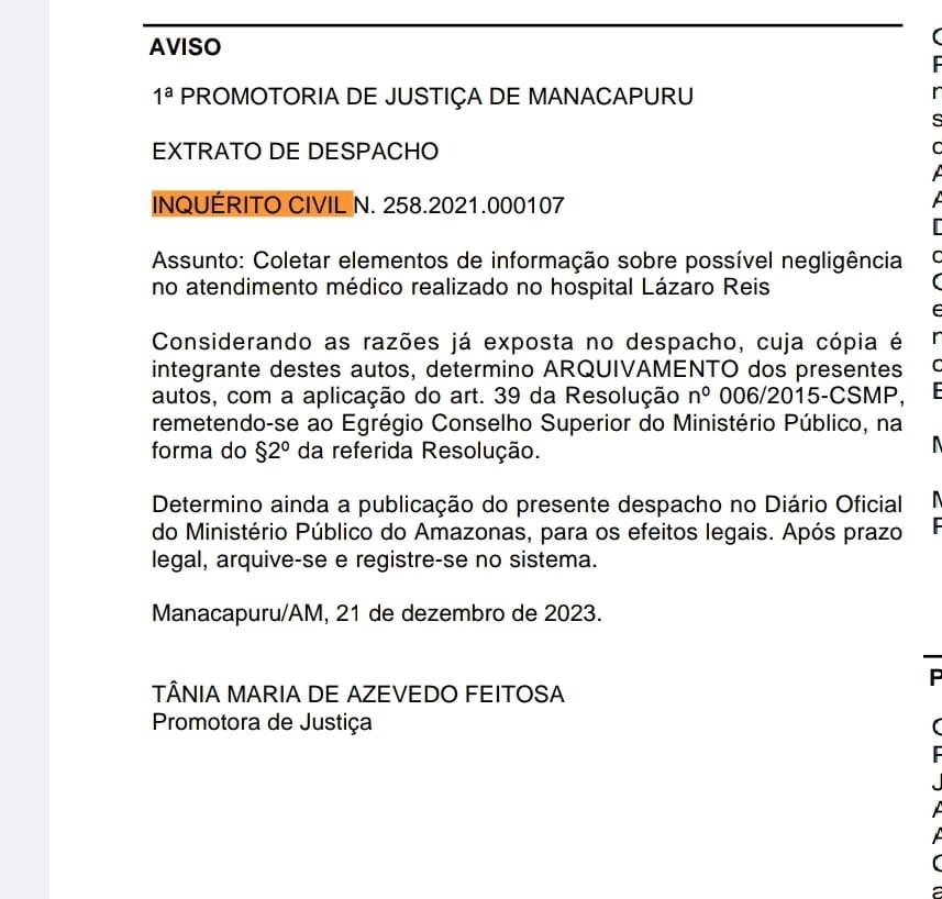 O Ministério Público do Estado do Amazonas (MPAM) arquivou Inquérito Civil (IC) que investiga sobre coleta de elementos de informação de possível negligência no atendimento médico realizado no Hospital Lázaro Reis em Manacapuru, a 98,8 quilômetros de Manaus.