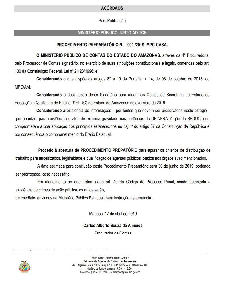 Para instaurar o procedimento, o MPC considerou a existência de informações – por fontes que devem ser preservadas neste estágio – que apontam para existência de atos de extrema gravidade nas gerências da Departamento de Administração e Infraestrutura (Deinfra), órgão da Seduc, que comprometem a boa aplicação dos princípios estabelecidos no caput do artigo 37 da Constituição da República e por consequência o comprometimento do Erário Estadual.