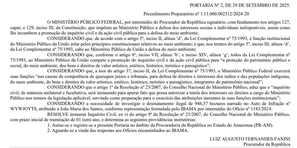 O Ministério Público Federal (MPF) instaurou um inquérito civil para investigar um caso de desmatamento ilegal de 946,57 hectares no Estado do Amazonas. A apuração, formalizada pela Portaria nº 2, de 29 de setembro de 2025, foi determinada pelo procurador da República Luiz Augusto Fernandes Fanini, com base em representação encaminhada pelo Instituto Brasileiro do Meio Ambiente e dos Recursos Naturais Renováveis (Ibama).