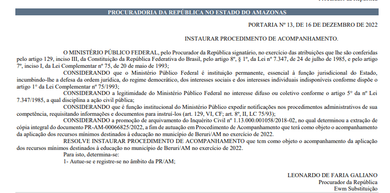 “Considerando a promoção de arquivamento do Inquérito Civil nº 1.13.000.001058/2018-02, no qual determinou a extração de cópia integral do documento PR-AM-00066825/2022, a fim de autuação em Procedimento de Acompanhamento que terá como objeto apurar aplicação dos recursos mínimos destinados à Educação de de Beruri no exercício de 2022”, apontou o procurador da República.