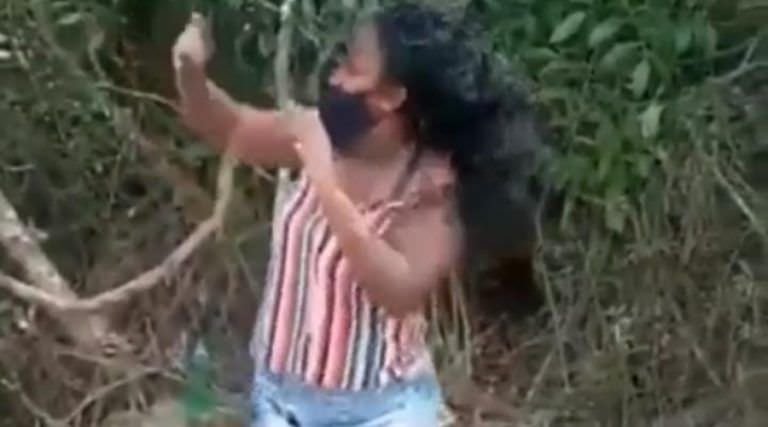 No vídeo é possível observar que a mulher foi levada para uma área de mata e foi espancada com as ripas feitas com galhos de árvore. Pelo menos 3 homens agridem a suspeita.