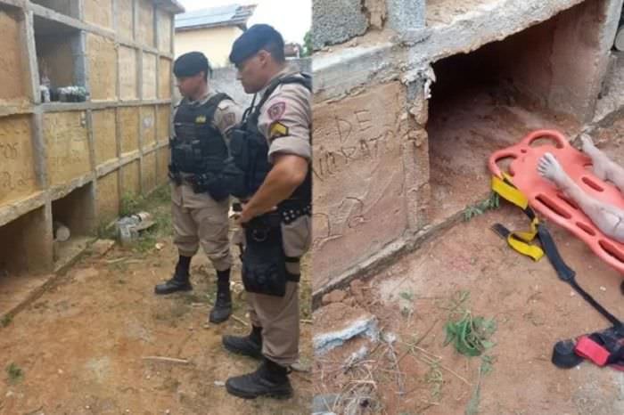 Ao chegarem ao local, os militares também escutaram os pedidos de socorro da vítima. O túmulo em questão estava fechado com tijolos e cimento fresco, e tinha manchas de sangue. “A lápide estava fechada com tijolo e massa, que foi quebrado para poder socorrer a vítima”, contou um militar que atendeu à ocorrência.